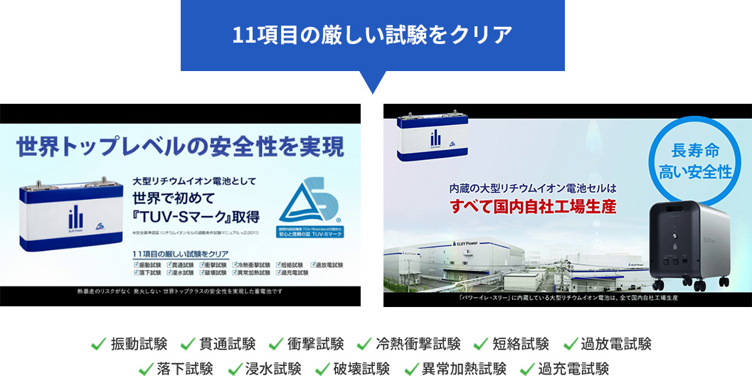 システムに内蔵している大型リチウムイオン電池は、全て国内自社工場生産。正極材料に安全性に優れたオリビン型リン酸鉄リチウムを採用しています。国際的認証機関TUV Rheinland(テュフ ラインランドジャパン)が策定した過酷な11項目の試験をすべてクリア。世界で初めて(※安全基準認証(リチウムイオンセルの過酷条件試験マニュアル v.2:2011)TUV-Sマークを取得しました。