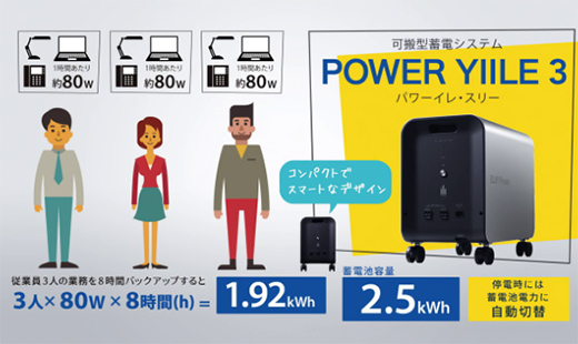 「いざ停電して、改めて蓄電池のありがたみを再認識した。パワーイレ・スリーの備えがあって助かった。総務部で使用していたが、備えの無い他部署との取り合いになった。」というお声もございます。